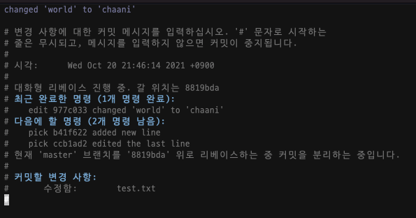 5. 'git rebase --continue'를 입력하면 아래와 같이 vim 편집기가 다시 열리고 :wq를 입력해서 빠져나옵니다.